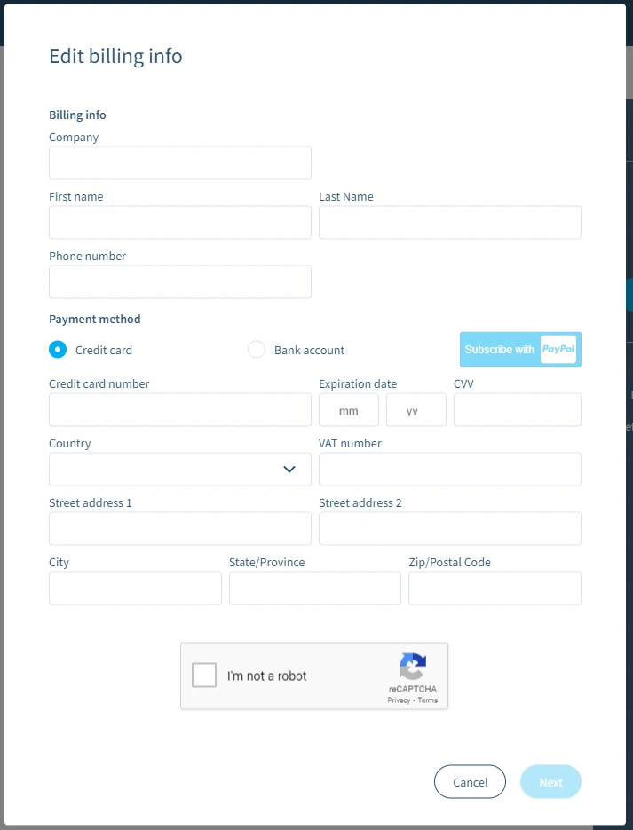 To modify or upgrade your billing plan, click the "Change plan" button on the billing page: