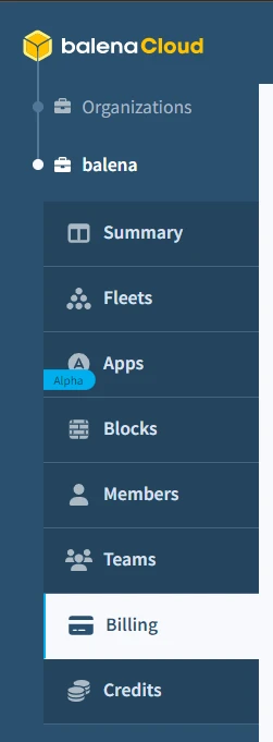 Billing in balenaCloud is managed through organizations. To manage billing for a specific organization, navigate to the organization and select the Billing tab from the sidebar on the left: