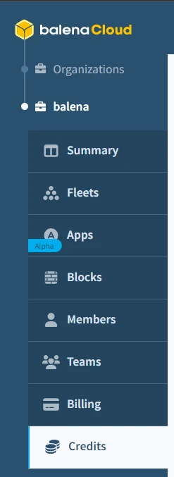 To manage credits, navigate to the organization and select the Credits tab from the sidebar on the left: