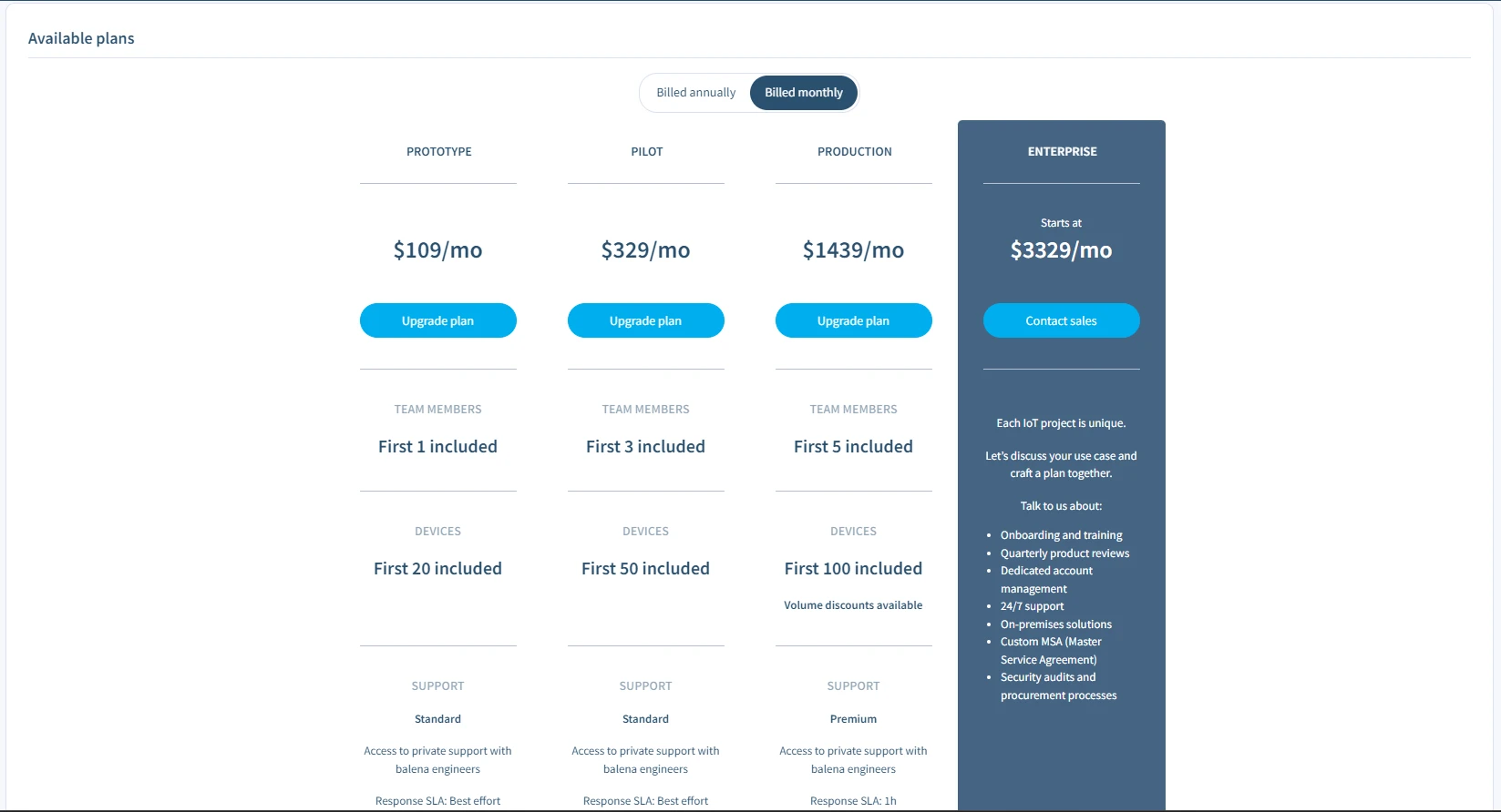 To enable customers to drive down their device usage costs, balena has an optional credit-based purchasing model available. A credit represents a pre-purchased unit that corresponds to the usage of one device exceeding plan allowance for one month. At the end of each monthly billing cycle, any available credits are used first before a dynamic charge is initiated. This system is available for all non-Prototype customers.